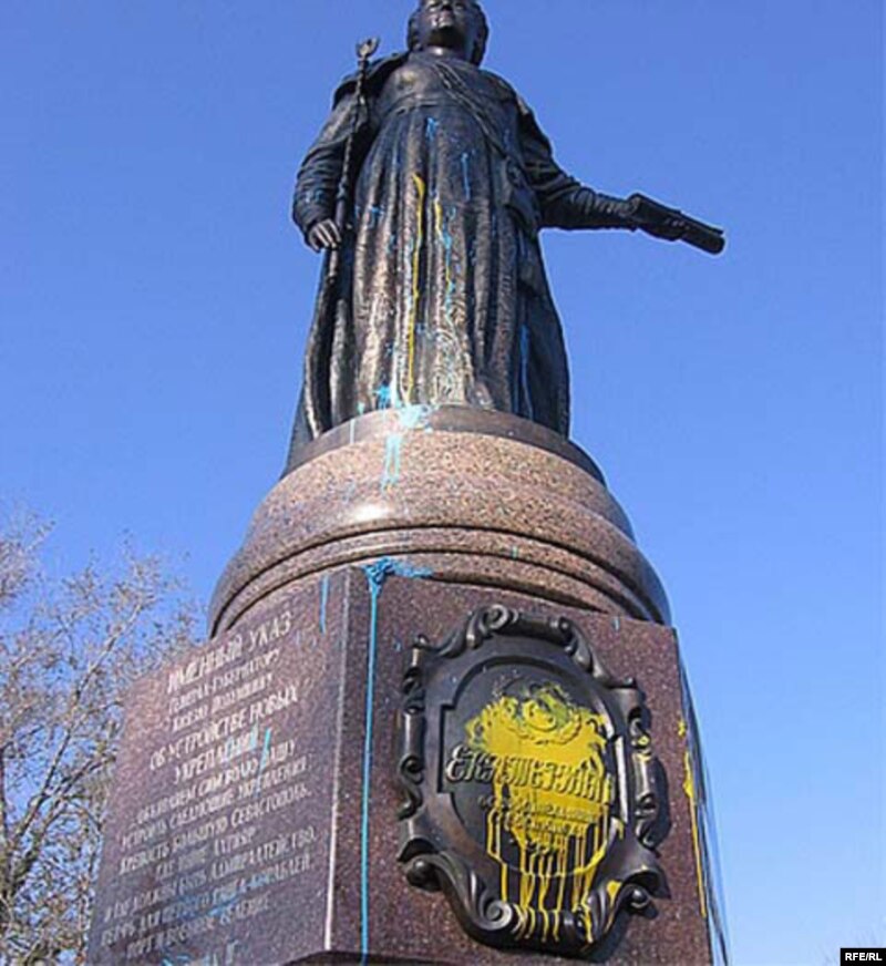 За інформацією правоохоронців Севастополя, свідки бачили, як двоє чоловіків близько другої години ночі втікали від пам’ятника Катерині Другій. Уже до обіду працівники комунальних служб міста відмили фарбу з монумента, а проросійські активісти принесли нові квіти.