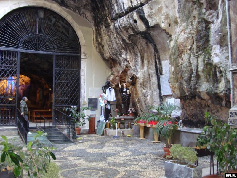 Церква ніби вмонтована у скелю, до якої ще треба підніматися сходами, але це вже дрібниці. Сюди паломники приходять пішки босоніж від самого міста, щоб вклонитися Святій Розалії, заступниці Палермо і всієї Сицилії.