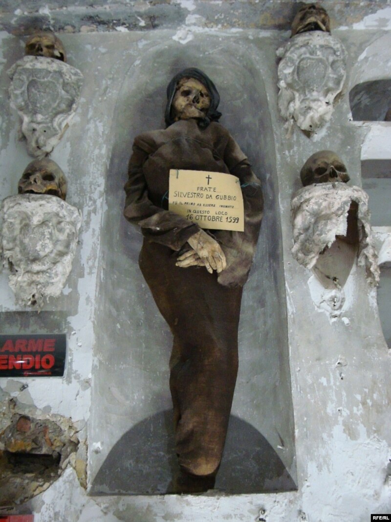Більшість мумій ще й одягнені або ж обмотані у старе лахміття. Власне, це зараз, після чотирьох століть, воно виглядає таким. На момент поховання мерців залишали у їхньому одязі. А те, що здається якимось лахміттям, ніщо інше як ряси братів-капуцинів. Ось із них наприкінці XVI століття усе і почалося, розповідає сивий чоловік, отець Ауреліо Ді Вяджі. Він у коричневій рясі, підв’язаній мотузкою, та в сандалях на босу ногу – справжній монах-капуцин.