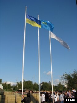 На місці будівництва Соборної мечеті підняли український і кримськотатарський прапори і прапор тюркської молоді світу. Сімферополь, 12 серпня 2009 р.
