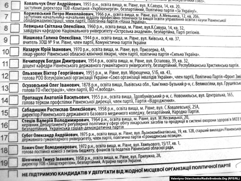Бюлетень 40-го одномандатного мажоритарного виборчого округу міста Рівне. Під №13 - людина, яка "народилася" 132 роки тому. Під №18 - кандидат від БЮТ, у якого в бюлетені "забрали" партійність