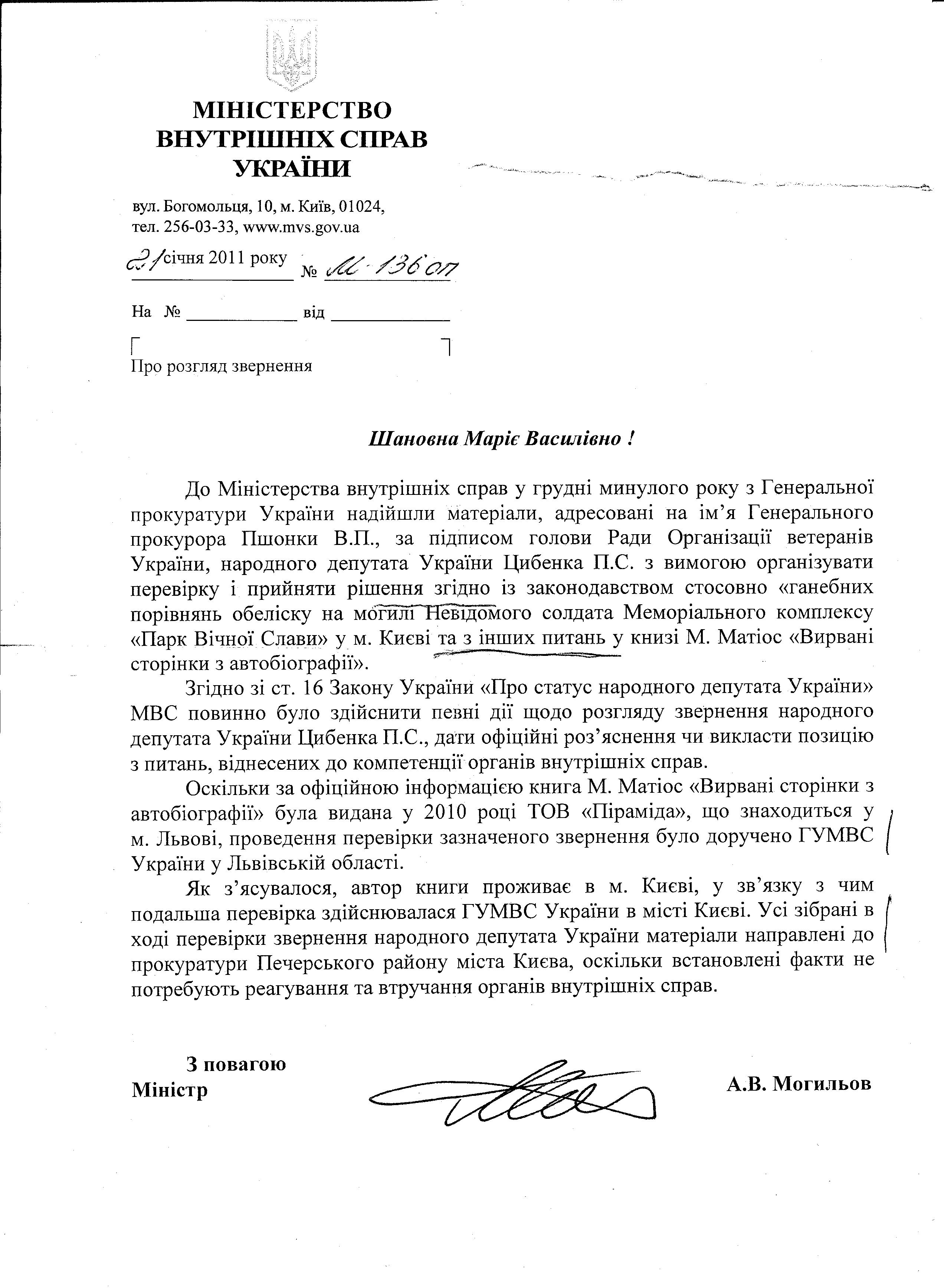 Лист надійшов поштою. У ньому, зокрема, міністр повідомляє, що правоохоронні органи діяли згідно з матеріалами, надісланими Генеральною прокуратурою. Могильов зазначає, що «на ім’я Генпрокурора Пшонки В.П., за підписом голови Ради Організації ветеранів України, народного депутат України Цибенка П.С. з вимогою організувати перевірку і прийняти рішення згідно із законодавством стосовно «ганебних порівнянь обеліску на могилі Невідомого солдата Меморіального комплексу «Парк Вічної Слави» у м. Києві та з інших питань у книзі М. Матіос «Вирвані сторінки з біографії».
