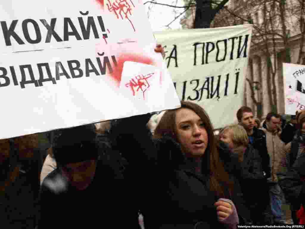 Студенти, зокрема, протестують проти планованого скорочення держзамовлення. У листівках, які роздають охочим, йдеться, що в разі ухвалення оновленого закону чесний вступ до вишів стане неможливим