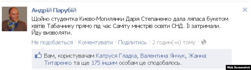 У свою чергу Табачник затримав студентку за руку. Незабаром охорона заходу передала дівчину міліції.