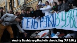 Учасники акції протетсу принесли до офісу компанії ЕСТА, що поблизу будівлі МЗС, будівельне сміття. Як стверджують організатори, вони хочуть, щоб Рінат Ахметов, зрозумів, яким важливим для столиці є узвіз.