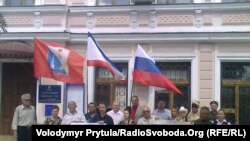 Півтора десятка людей із російськими, кримськими і севастопольськими прапорами, а також плакатами «Геть Євро!» і «Даєш бойкот Євро!» уже втретє за останні кілька тижнів зібралися біля Центрального районного суду Сімферополя. Там триває процес за звинуваченням одного з активістів Народного фронту «Севастополь-Крим-Росія» Володимира Тюніна у розпалюванні міжнаціональної і міжрелігійної ворожнечі посадовою особою.