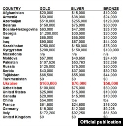 Грузинські спортсмени, якщо здобудуть золото, можуть розраховувати на 1,2 мільйона доларів, Азербайджан за перші нагороди готовий вручити спортсменам 510 тисяч доларів, Казахстан – 250 тисяч.