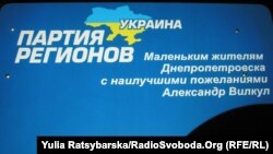 Майданчики з гойдалками на Дніпропетровщині «за підтримки Партії регіонів» відкривають чи не щодня. Громадські активісти в регіоні зафіксували близько 50 випадків брендування дитячих майданчиків, які встановлюються за бюджетні кошти, символікою Партії регіонів. Відкриття цих об’єктів, каже керівник громадського руху «Спільна справа» в Дніпропетровській області Віктор Романенко, використовують для агітації за партію і її кандидатів. На урочистостях дітям дарують солодощі й прапорці Партії регіонів, а до проведення самих заходів добровільно-примусово залучають бюджетників.