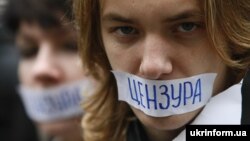 Київ – Під час виступу Віктора Януковича на Всесвітньому газетному форумі журналісти-учасники руху «Стоп цензурі!» підняли плакати, що повідомляють про утиски свободи слова. Президентська охорона намагалася завадити акції і виривати з рук її учасників плакати. Тим часом Президент зробив вигляд, що нічого не помітив і продовжив свою розповідь про досягнення вільних ЗМІ та свободу слова в Україні.