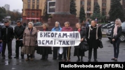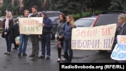 У руках учасники акції тримали плакати з написами «Землі – так, виборам – ні», «Нам – дулю, вам – долари?», «Банді стоп!».