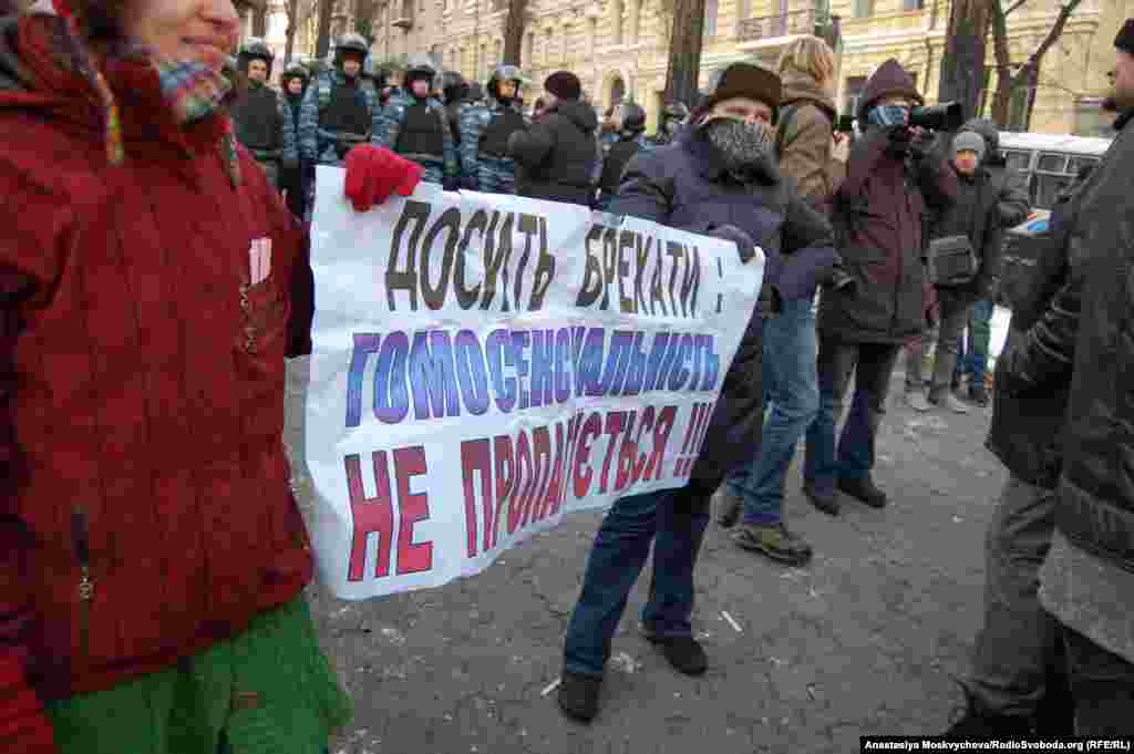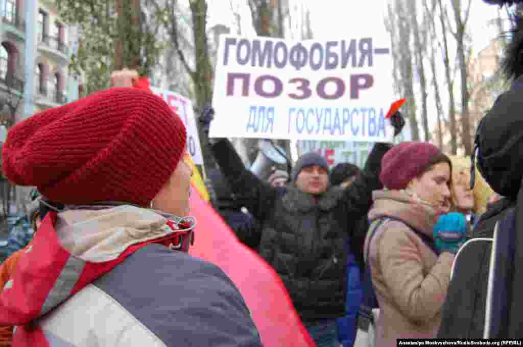 У центрі Києва відбулася акція проти законодавчих ініціатив щодо заборони пропаганди гомосексуалізму та щодо мирних зібрань. Учасники мітингу вважають, що так в Україні хочуть обмежити права людини.