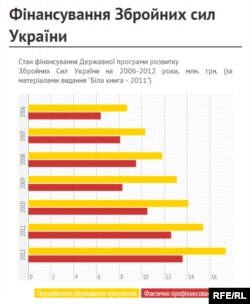 Співставлення запланованих і реальних видатків на утримання й модернізацію української армії демонструє стале недофінансування. Однак в цілому видатки зростають.