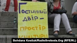 Народні депутати від «Батьківщини» і депутати Київради намагаються провести громадян усередину, щоб долучити їх до розгляду питання забудови Гостиного двору.