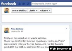 «Нарешті в аеропорту, по дорозі до Варшави. Дякую «АероСвіту» за 3 доби пригод, очікувань та «милих» розмов із вашим сервісним центром. І справді величезне спасибі польським LOT, які продали мені реальний квиток на реальний літак», – ділиться враженнями від невдалого перельоту на своїй сторінці у Facebook Анна Бєлкіна.
