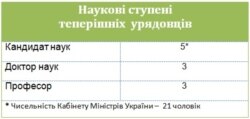 Третина міністрів здобули наукову ступінь. Докторами наук є Микола Азаров, Дмитро Табачник та Раїса Богатирьова.