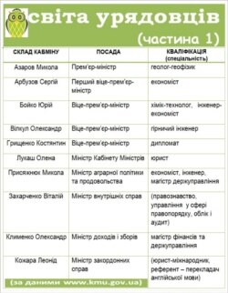 Житлово-комунальною сферою та регіональним розвитком займається інженер-метеоролог Геннадій Темник, міністерством закордонних справ керує юрист-міжнародник Леонід Кожара, а прем’єр-міністр Микола Азаров є доктором геолого-мінералогічних наук.