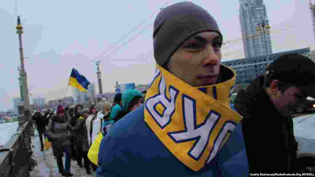 Учасники традиційної акції зустрілися посередині мосту Патона у Києві, розтягнули український прапор та співали національний гімн.