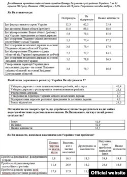Переважна більшість громадян України не підтримує ідею «утворення на території України двох незалежних держав – на основі Південно-східних областей і на основі Західних і Центральних областей». Такий результат опитування, проведеного соціологічною службою Центру Разумкова в усіх регіонах України у вересні 2012 року.