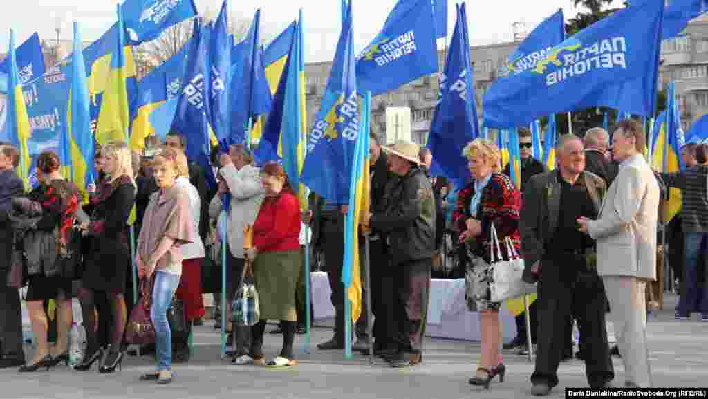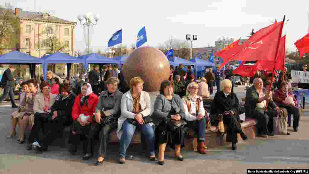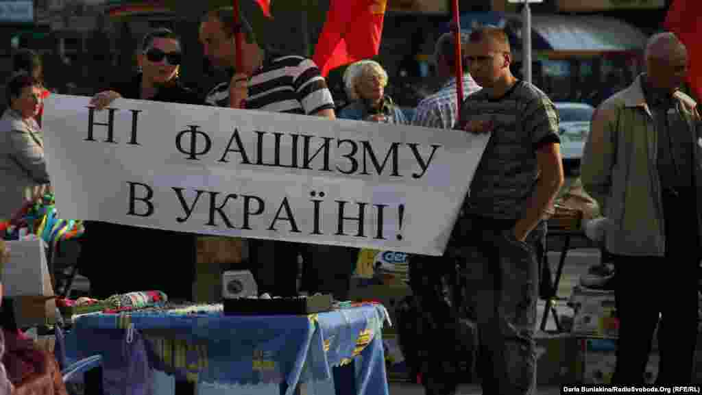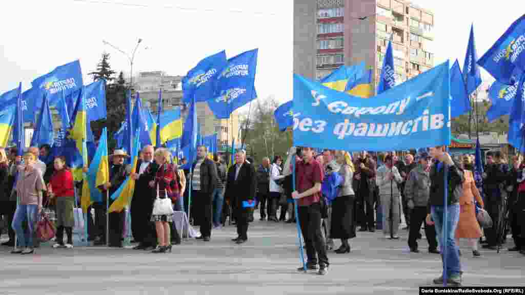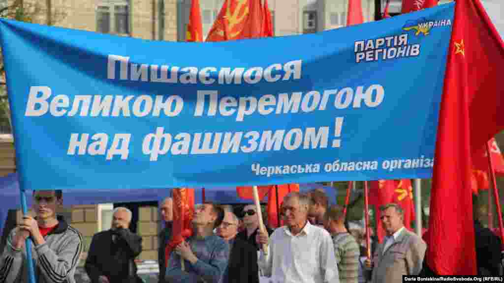 На Соборній площі, де спершу мав відбуватися опозиційний мітинг, черкаська обласна влада організувала «антифашистський мітинг» – концерт «патріотичної» пісні. Кілька десятків черкащан стояли із прапорами Комуністичної партії, Партії регіонів та з блакитними плакатами із підписами Партії регіонів: «У Європу без фашистів», «Ні фашизму в Україні», «Пишаємося Великою перемогою над фашизмом». Причому «фашистами» ті, хто виступав зі сцени, називали нинішніх опозиціонерів, зокрема, ВО «Свобода».