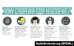 Тим часом, на початку вересня ідея створення ЄДДР отримала нове фінансове дихання – Кабмін затвердив план заходів щодо впровадження біометричних паспортів та виділив на його втілення (у тому числі на створення ЄДДР) суму у 793,3 мільйона гривень. Це, звісно, не зимова Олімпіада в Сочі, але кошти немалі, а відповідно і нові корупційні можливості. Але нам передусім ідеться про ризики цього закону з точки зору порушень права людини на приватність, яке ще називають правом «бути залишеним у спокої». На цю тему написано вже немало. Тому ми вирішили її візуалізувати.