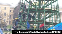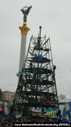 Учасники акції почали вилазити на каркас ялинки і вішати прапори України і ЄС на неї.