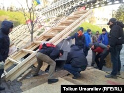 Вдень укріпляли барикади з деталей ялинки. Здалеку видно, з чого зроблений кордон: на пластинах намальовані сніжинки. Сам каркас «йолки» мітингувальники прикрасили прапорами і плакатами. Охорона підкидає дрова у бочки, їм приносять їжу і збирають пожертви на функціонування містечка.