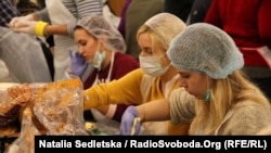 Заходити стороннім сюди не можна – санітарна зона. Тут вдень і вночі працюють дівчата, жінки – всі волонтери. Їм роздають спеціальний одяг та гумові рукавиці. Волосся підібране. Підлогу миють часто. Співають українські народні пісні.