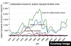 При цьому кількість загиблих при терористичних атаках змінюється нелінійно.