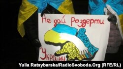 У руках вони тримали синьо-жовті та червоно-чорні прапори, а також плакати з написами «Не дай роздерти Україну», «Приєднуйся до нас», «Ми тут за чесність» тощо, повідомляє кореспондентка Радіо Свобода.