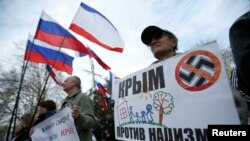 Усі потужності пропагандистської машини Кремля націлені на те, щоб переконати громадян Росії та України, а також увесь світ у тому, що, як сказав в «Известиях» письменник Олександр Проханов: «На западе украинские города один за другим становились фашистскими. Их жуткая ненависть к русским, яд фашистской энергии хлестнули из Киева по левобережным городам Украины. Русским показали, как выглядит их плаха, как висит над ними топор, как раскачивается над ними петля. Если в сорок третьем фашисты тысячами убивали евреев и сбрасывали их в Бабий Яр, то теперь носители свастик готовы отрыть на Левобережье гигантский котлован и сбросить в него тела двадцати миллионов русских».