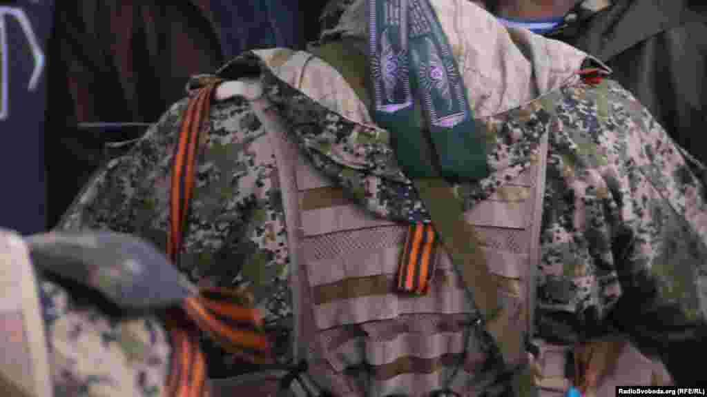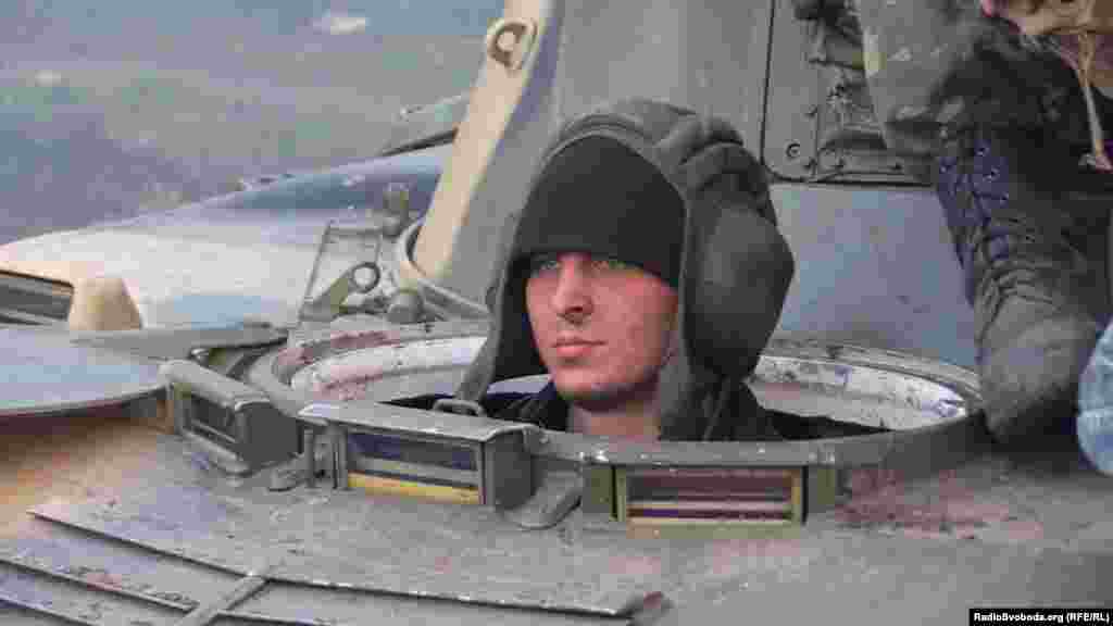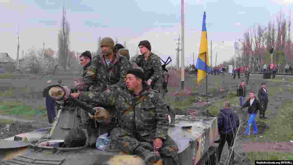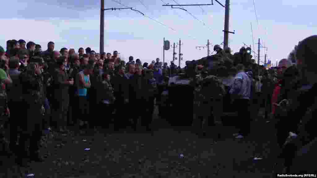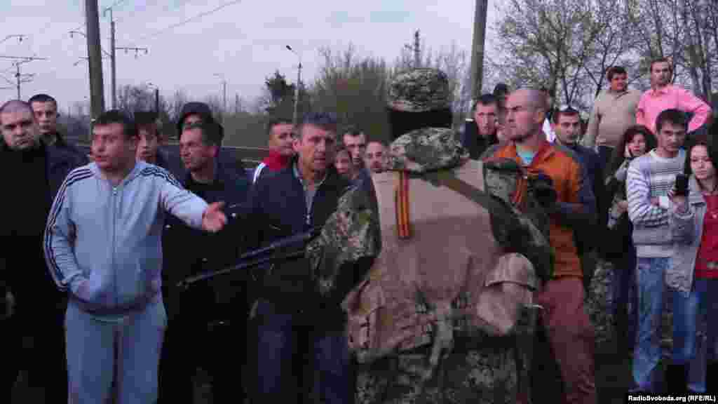 Пчолкіно, залізничний переїзд поблизу Краматорська. Місцеві мешканці і озброєні чоловіки з георгіївськими стрічками блокують колону української військової техніки (16 квітня 2014 року).