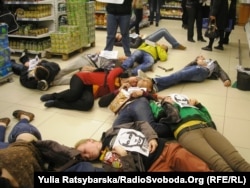Близько двох десятків юнаків та дівчат з синьо-жовтою атрибутикою та товарами російських виробників у руках демонстративно впали на підлогу й «померли». Дехто з учасників акції тримав у руках також листівки «Не купуй російське!», портрети Володимира Путіна та плакати з написами «Російське вбиває!», «Кожен товар повернеться кулями», «Кожен покупець російських товарів фінансує війну».