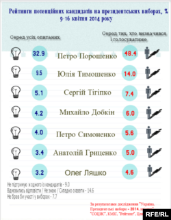 Лідерами рейтингу є Петро Порошенко та Юлія Тимошенко, яка за місяць майже не завоювала новий електорат. Натомість, Петра Порошенка зараз підтримує кожен третій українець, а це на 8% більше, ніж у березні. Відсотки решти кандидатів майже не змінилися за цей час.
