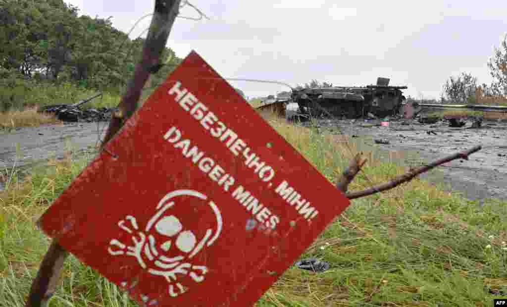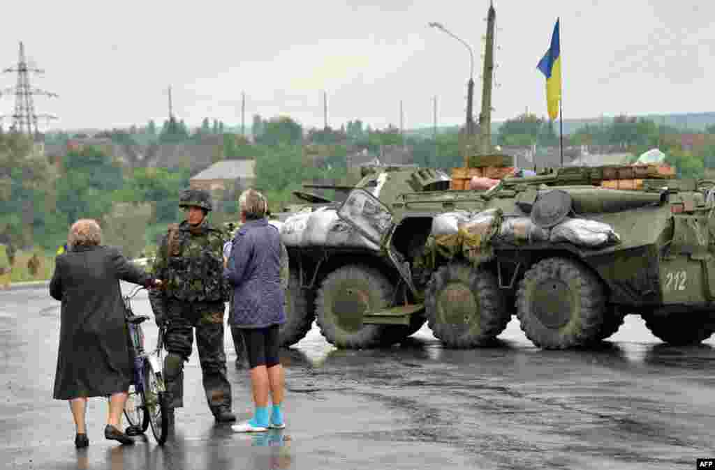 Місцеві жителі спілкуються з українськими військовими на дорозі зі Слов'янська в Краматорськ, де напередодні відбувся бій з проросійськими бойовиками.