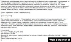 Згідно з реальним сценарієм сюжету, в Україні з’явилися нові наркотики, в тому числі так звані «спайси», що викликають «масові передозування» і були привезені українськими громадянами до Росії. Йдеться про те, що нібито цей новий наркотик виявили у Будинку профспілок в Одесі після того, як там побували члени українського радикального руху «Правий сектор», а далі до теми прив’язують «дурманні обіди» на «Євромайдані». В сюжеті також наголошується, що уряд України зробив «майже безкарним» зберігання невеликих, «за їхніми мірками», доз наркотиків. А далі: «Євроінтеграція вимагала змін, і в Україні зрозуміли, як бути ближче до «великого брата», – йдеться в тексті.