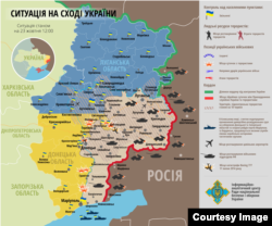 «Так, на околиці населеного пункту Суходольськ Краснодонського району Луганської області розташовано техніку бойовиків у складі 1 БТР та 1 установки «Град» на базі автомобіля КрАЗ, із намальованими білою фарбою двома лініями, що є розпізнавальними знаки належності бойової техніки до складу Збройних сил України. Крім того, на одному з підприємств Луганська замовлено виготовлення військових шевронів з українською символікою», – сказав Лисенко.