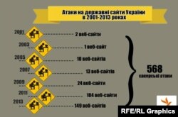 Згідно з даними сайту websecurity, з 2001 по 2013 рік хакери атакували 568 українських державних сайтів, і це без врахування інфікованих ресурсів із доменним ім’ям gov.ua. Якщо у 2001 році в Уанеті було лише два пошкоджених ресурси, то у 2013-му їхня кількість збільшилась до 149.