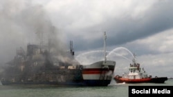 За штормової погоди вночі рятували людей із порому, що палає. Свідки: на судні багато вантажівок з бензином