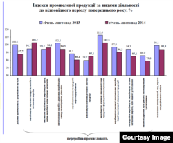 Металургія потерпає і від бойових дій, і від падіння світових цін. Пом’якшила падіння для багатьох експортних галузей девальвація гривні (собівартість їхньої продукції у доларах зменшилася). Харчова промисловість зміцнюється: більшість її йде на внутрішній ринок, на якому витісняє іноземні товари, що подорожчали через девальвацію гривні. Окремим галузям допомагає зона вільної торгівлі, яку в односторонньому порядку запроваджує ЄС».