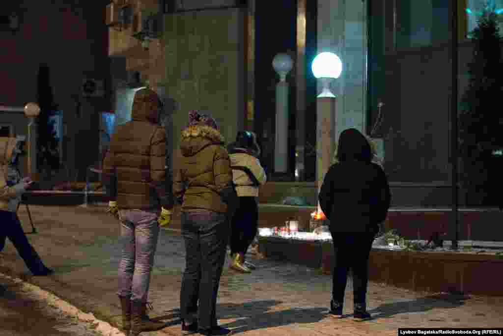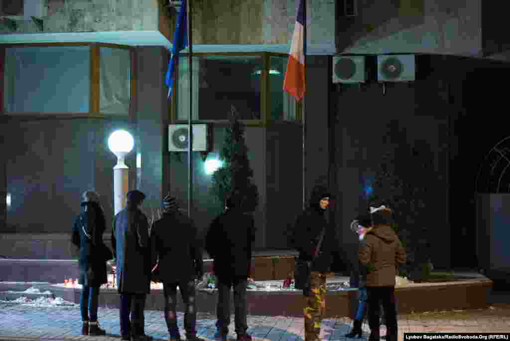 Кілька десятків людей прийшли до Посольства Франції в Україні, аби покласти квіти та запалити свічки. Кияни принесли під будівлю посольства кілька плакатів на підтримку свободи слова та на знак співчуття родинам і колегам загиблих, а також кілька карикатур, що раніше пулікувалися у тижневику Charlie Hebdo. ​У середу, 7 січня, у результаті нападу на редакцію було вбито 12 людей, ще 11 були поранені.