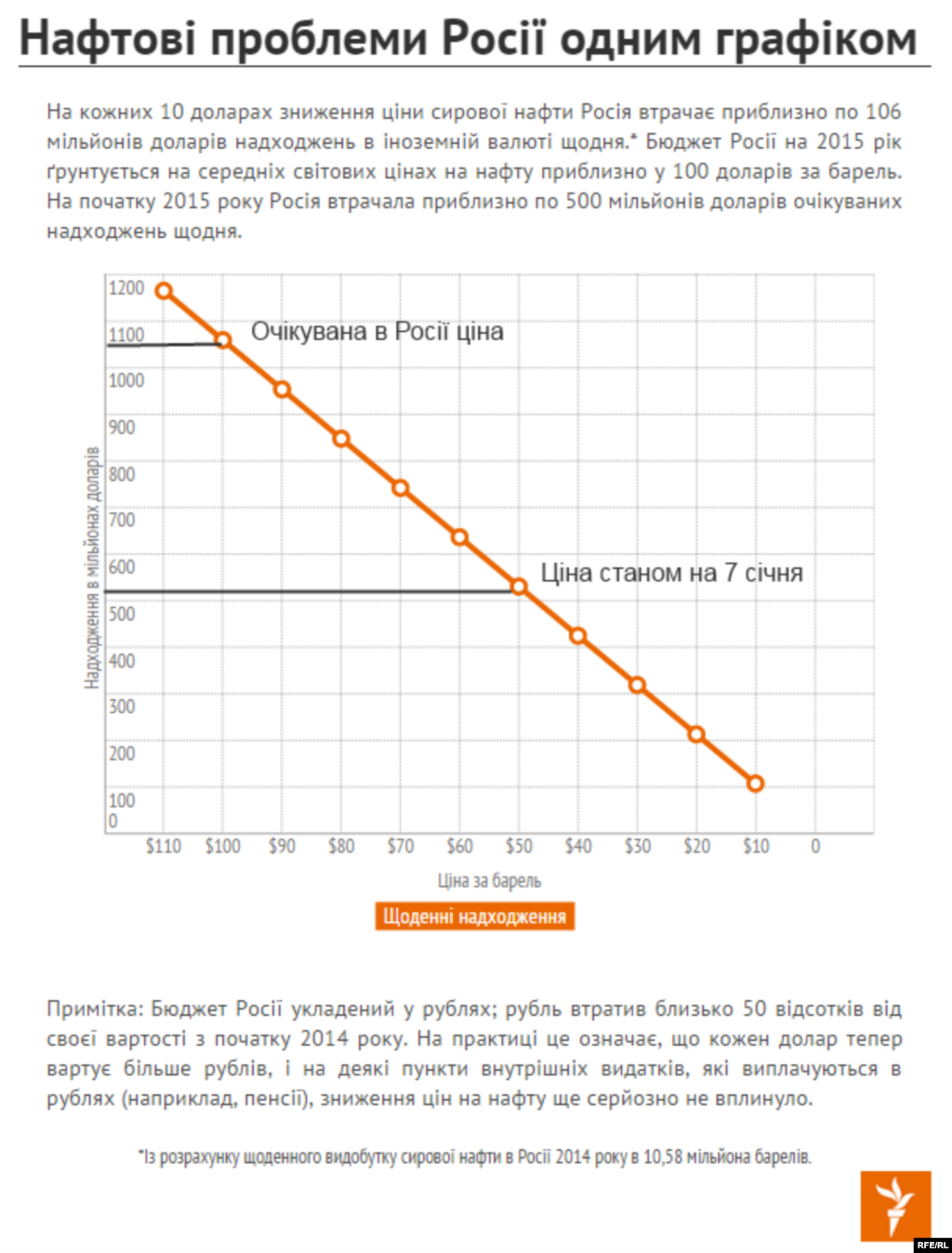На кожних 10 доларах зниження ціни сирової нафти Росія втрачає приблизно по 106 мільйонів доларів надходжень в іноземній валюті щодня.* Бюджет Росії на 2015 рік ґрунтується на середніх світових цінах на нафту приблизно у 100 доларів за барель. На початку 2015 року Росія втрачала приблизно по 500 мільйонів доларів очікуваних надходжень щодня.