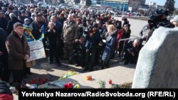 Учасники акції за пропозицією народного депутата від Запоріжжя й одного з лідерів місцевого Євромайдану встали навколішки, щоб вшанувати Героїв Революції. Також запорожці поклали квіти до пам’ятного знаку.