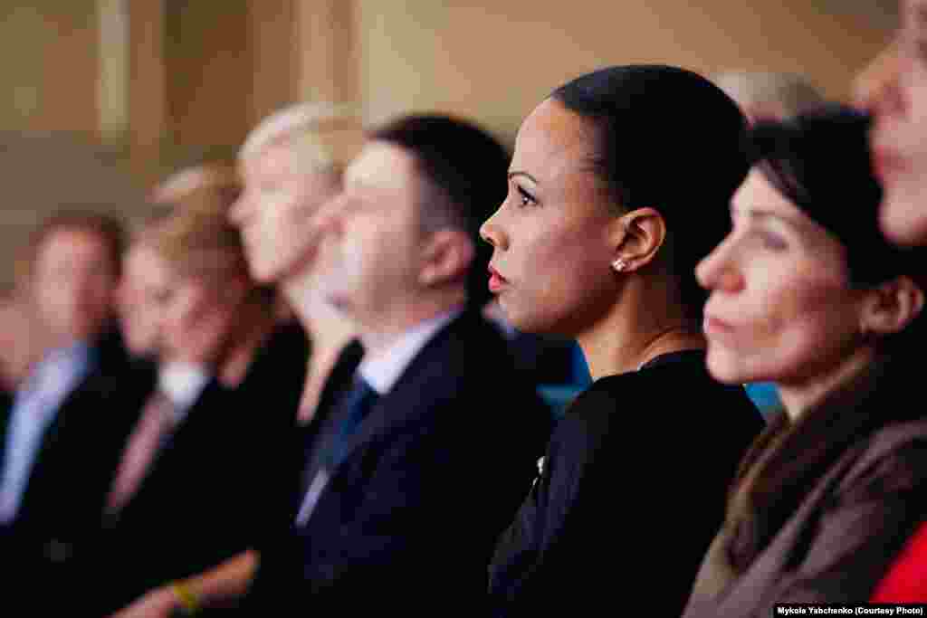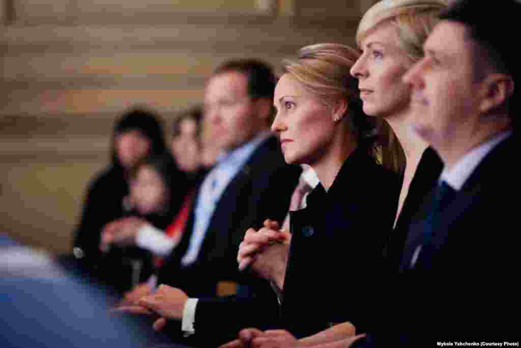(Зліва направо) Андерш Орн, директор програм, Шведський Інститут, міністр культури і демократії Швеції Еліс Бах Кунке, продюсер світового туру «Сім» Хедда Сйогрен, посол Швеції в Україні Андреас фон Бекерат. Київ, 26 березня 2015 року
