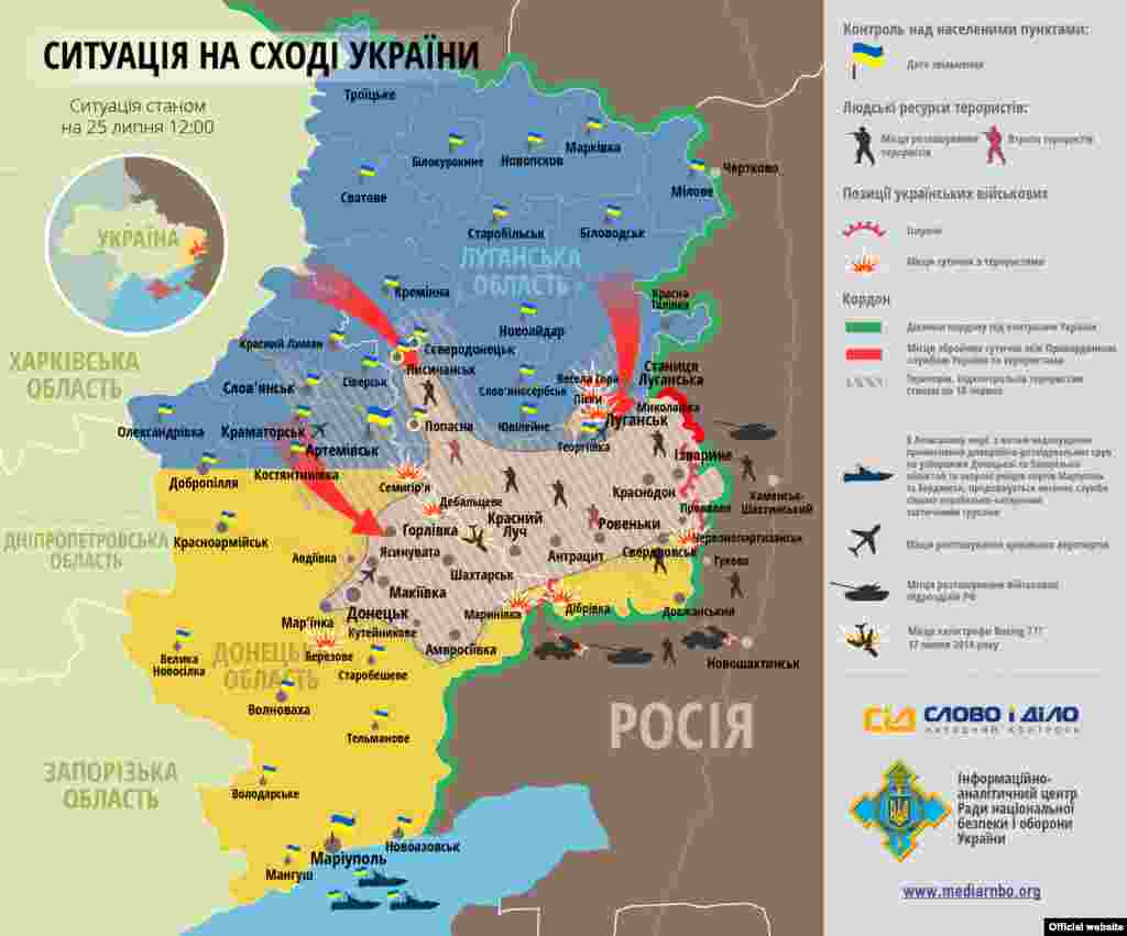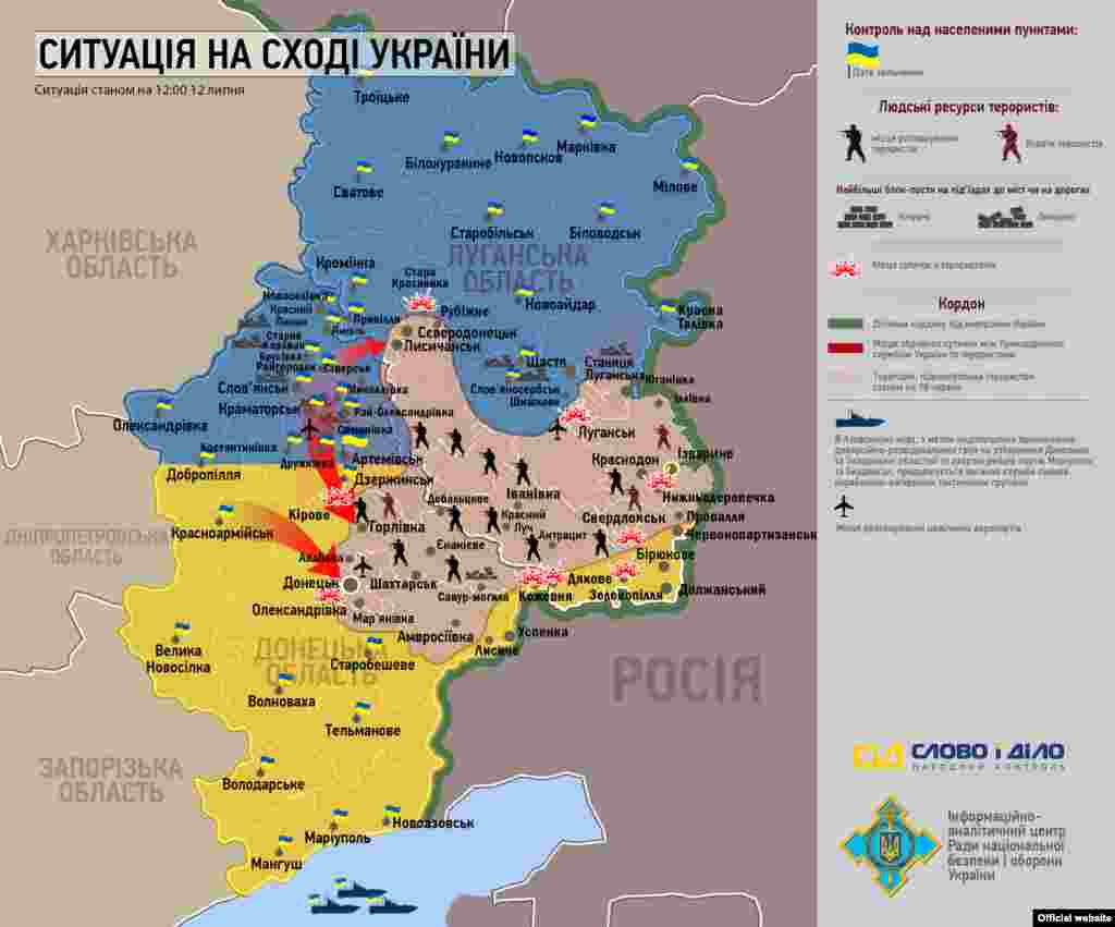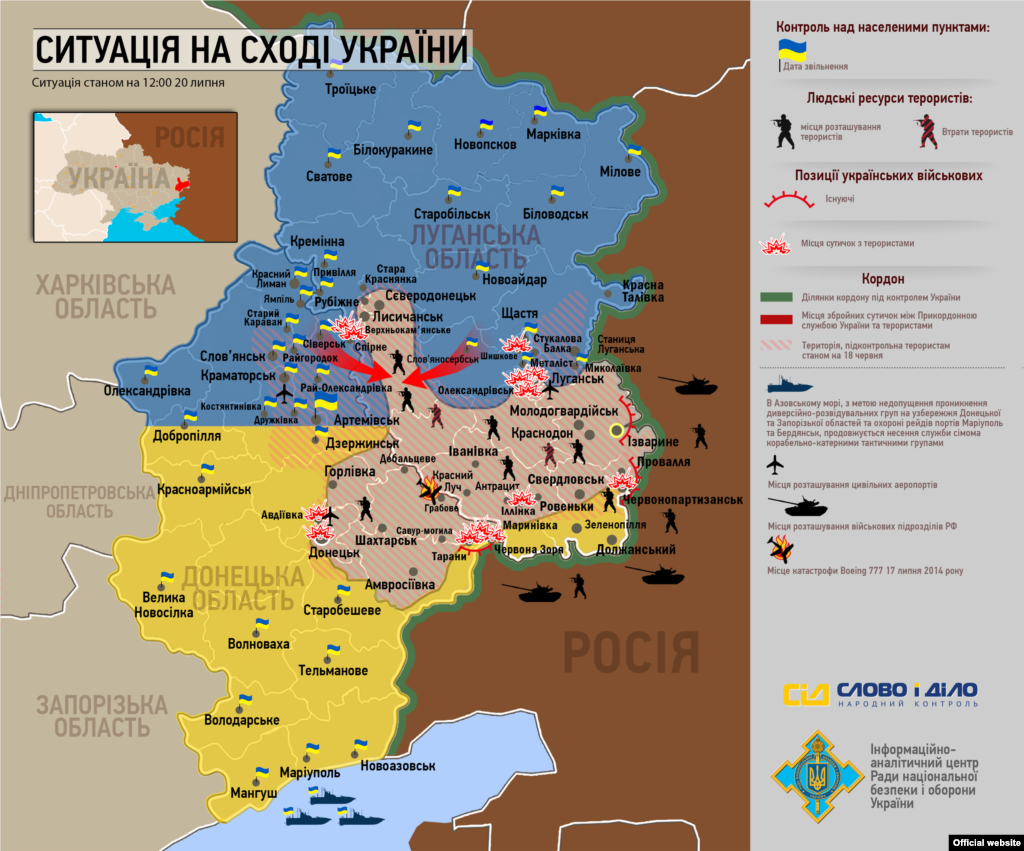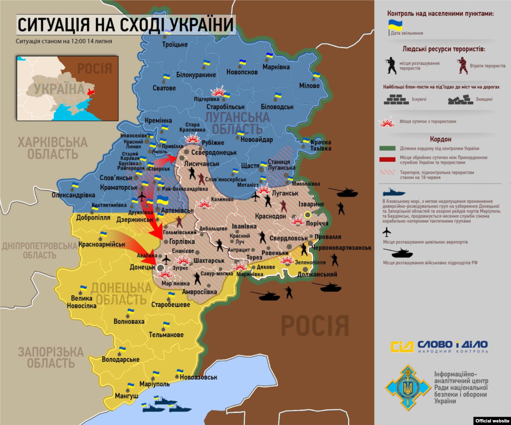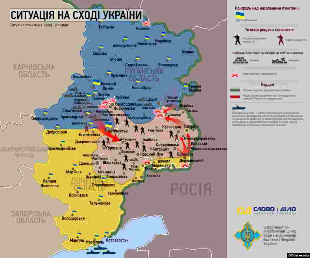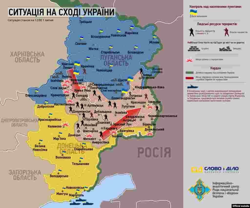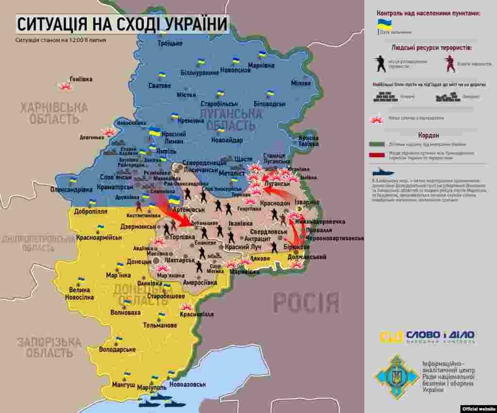 Розвиток ситуації у зоні АТО з 1 липня по 31 серпня 2014 року. Інфографіка Інформаційно-аналітичного центру Ради національної безпеки і оборони України