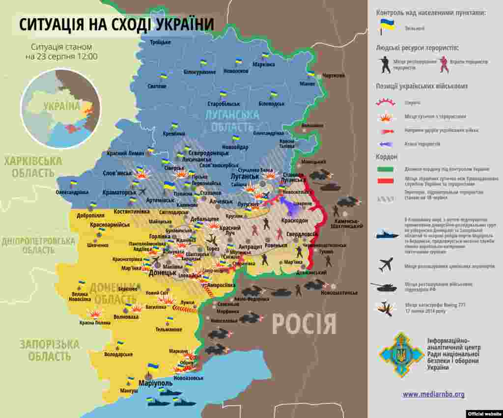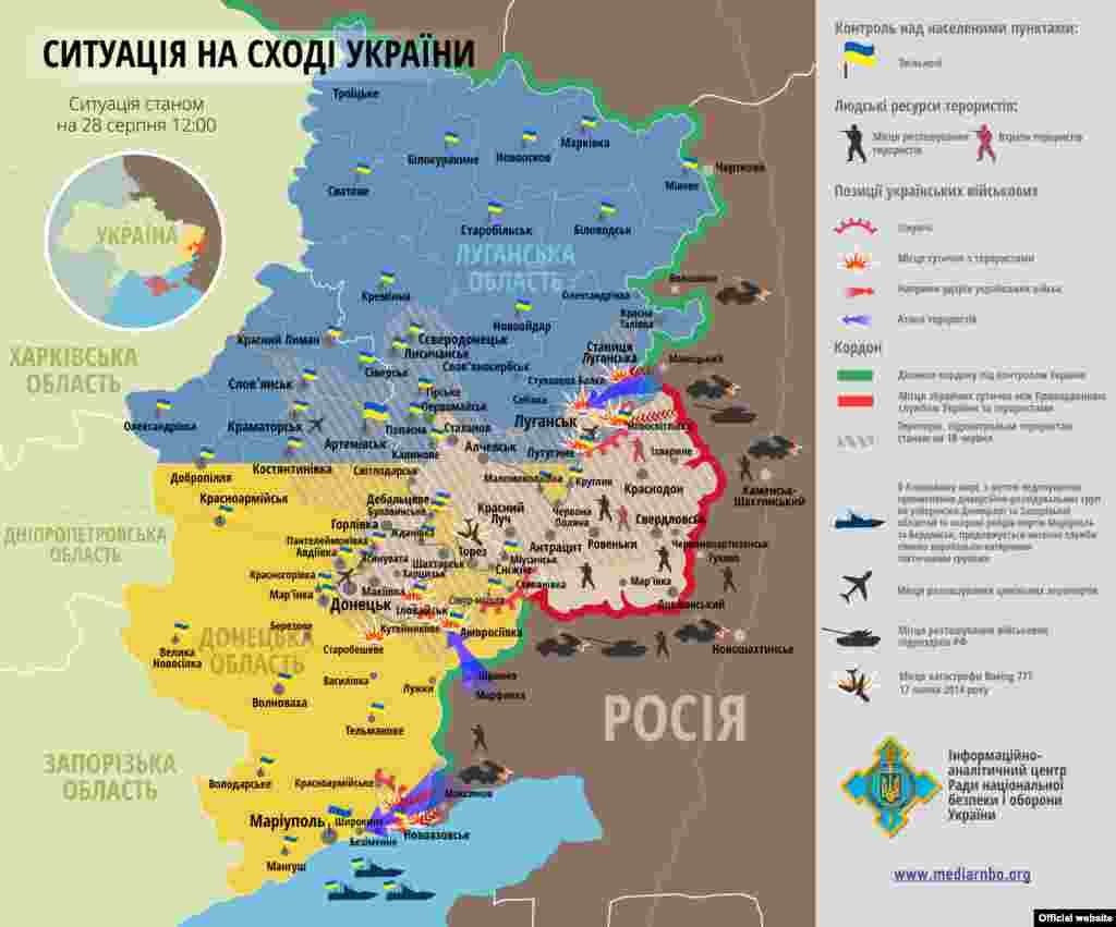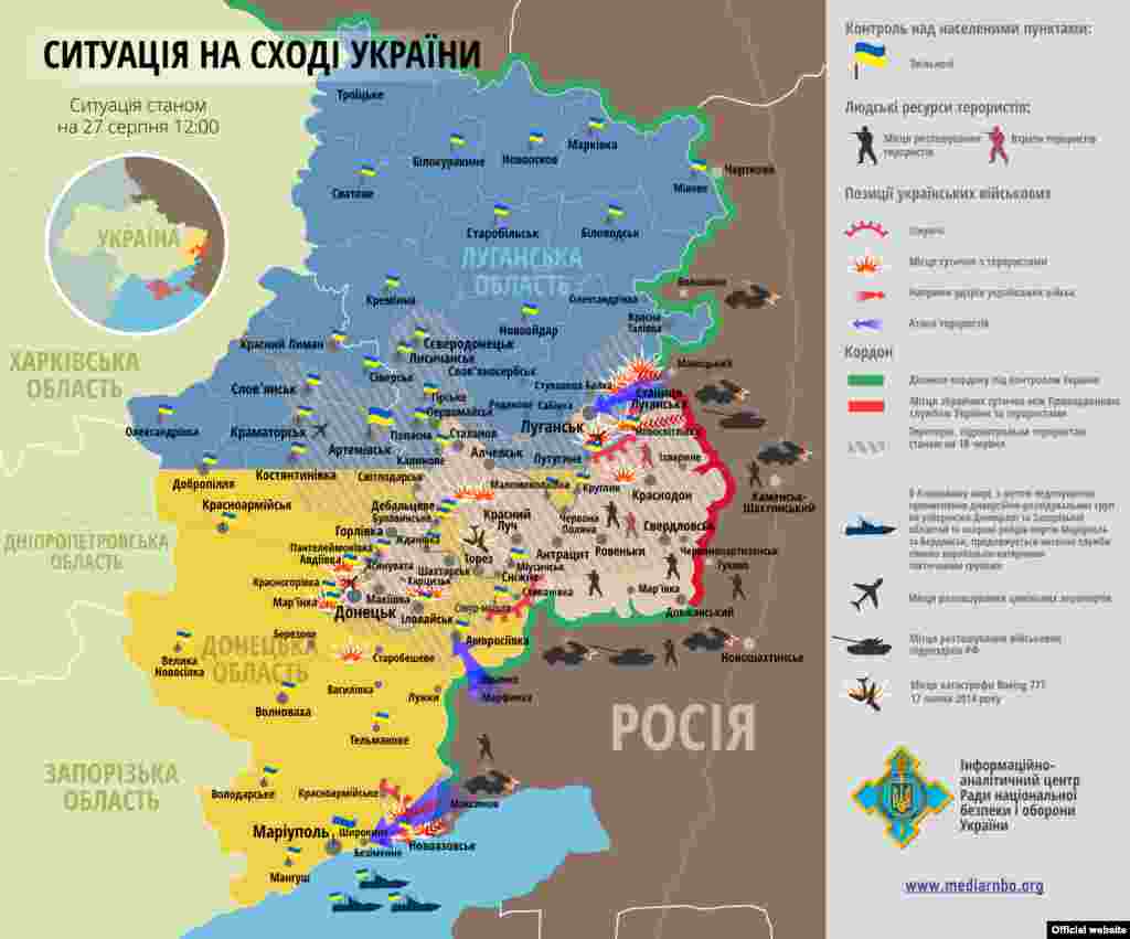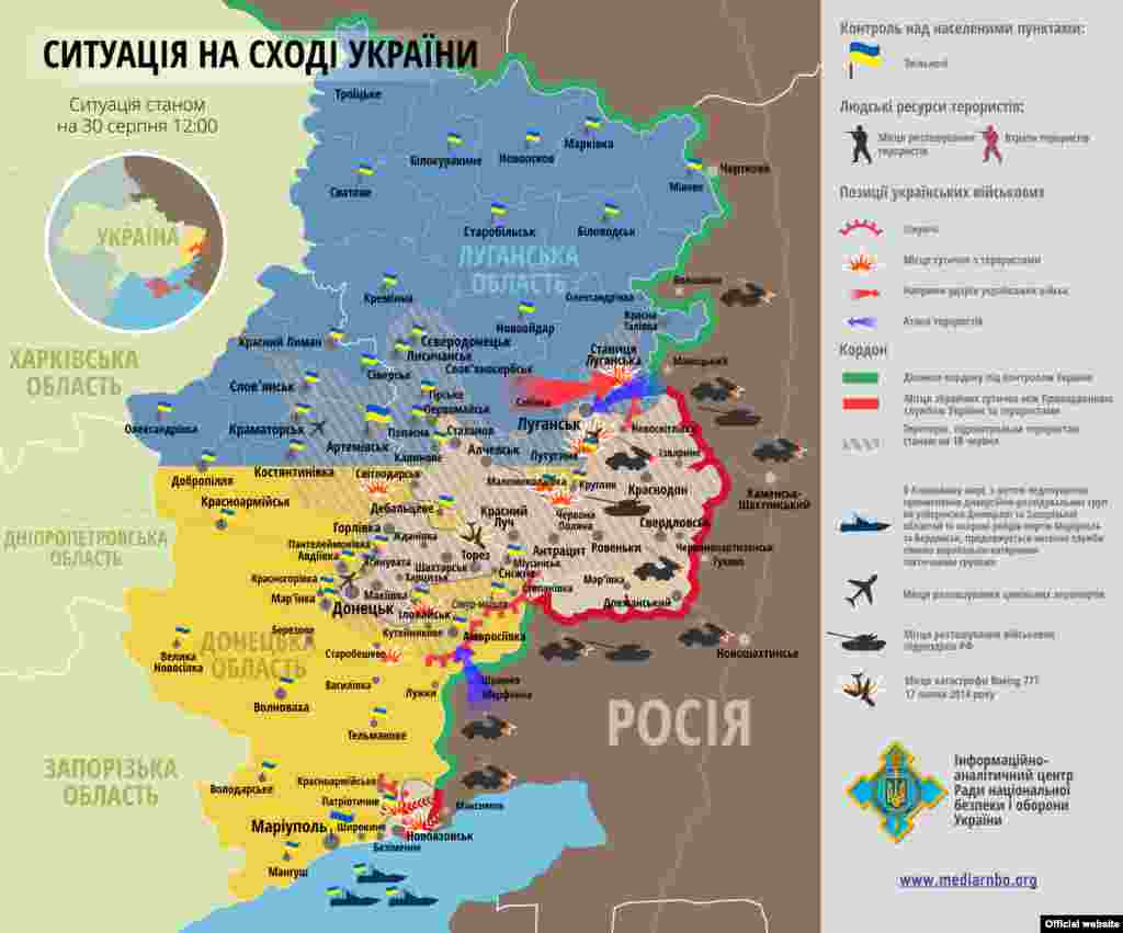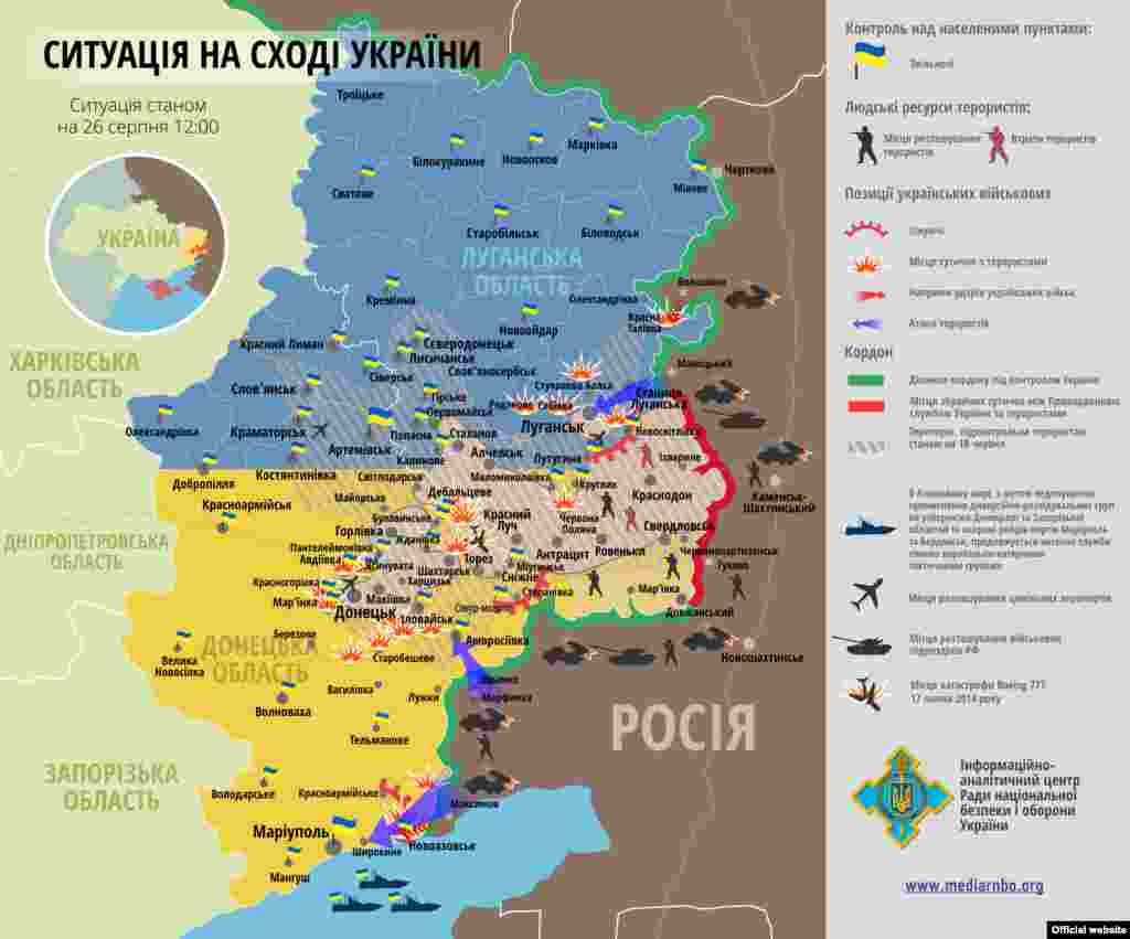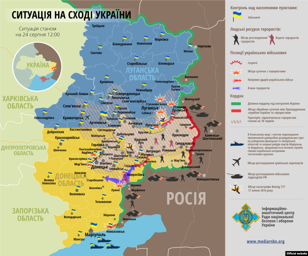 Розвиток ситуації у зоні АТО з 1 липня по 31 серпня 2014 року. Інфографіка Інформаційно-аналітичного центру Ради національної безпеки і оборони України