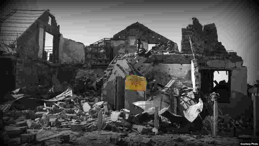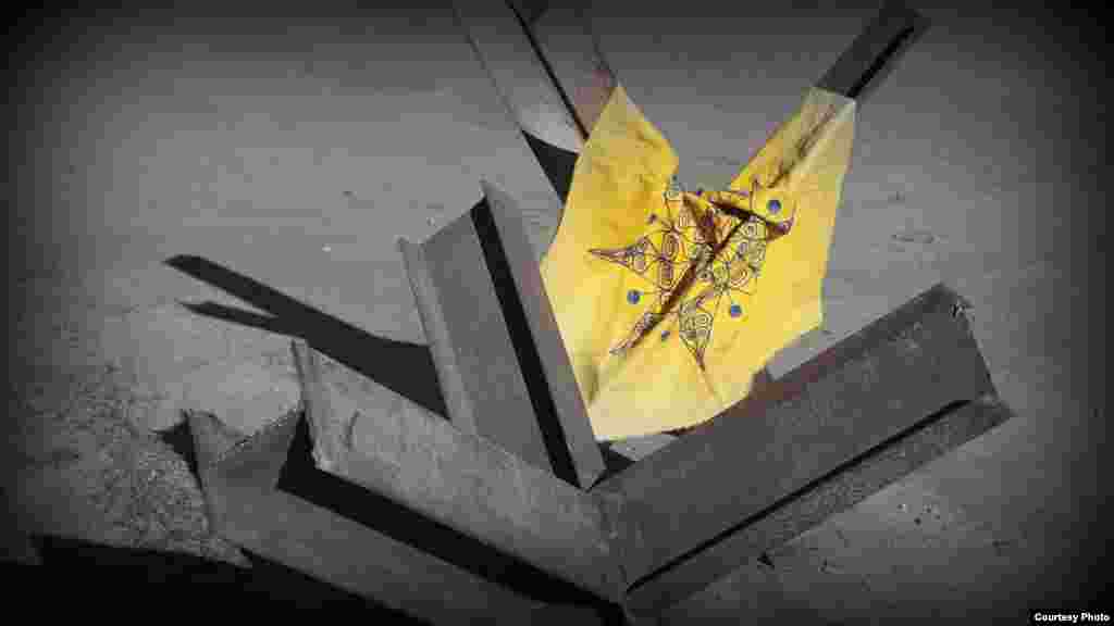 Проект складається із одного жовто-синього полотна, яке стало ключовим елементом фотографій із зони АТО. Робота Анжеліки Рудницької «Реконструкція світу» побувала разом із українськими бійцями кілька місяців у найгарячіших точках – від Широкина до Станиці Луганської.