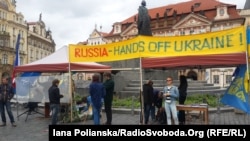 Упродовж року на Староміській площі у Празі, одному з найтуристичніших куточків чеської столиці, стоїть синьо-жовтий намет. Його щонеділі зводять українські та чеські активісти, щоб продемонструвати солідарність із Україною. Тут збирають підписи на користь посилення санкцій із боку ЄС та розповідають про події на Донбасі усім, хто цікавиться. За словами активістів, лише росіяни, які переконані у відсутності своїх військ на сході України, не вміють себе поводити толерантно – часто провокують «Празький майдан».