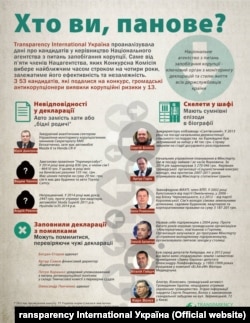 Паралельно аналіз резюме та декларацій кандидатів провела і «Transparency International Україна». Корупційні ризики активісти знайшли у кожного п’ятого. Зокрема, увагу привернули Сергій Бізікін, який, за словами активістів, обіймав посаду начальника Держінспекції сільського господарства на Харківщині і був затриманий на хабарі розміром 40 тисяч гривень. Зосередили свою увагу і на Артурі Горіні. На сьогодні він є начальником управління планування у Міністерстві молоді та спорту. І цю ж посаду він обіймав і за часів Януковича. Крім того, за 2014 рік Горін задекларував понад 3 мільйони гривень.