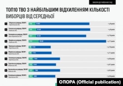 «До прикладу, рівень відхилення для районних рад подекуди перевищує 700%. Тобто масштаб, кількість виборців, які є в одному територіальному виборчому окрузі, порівняно з іншим територіальним виборчим округом в межах цієї громади подекуди в 7, майже у 8 разів відрізняється за кількістю виборців», – повідомила координатор парламентських і виборчих програм громадянської мережі «Опора» Ольга Айвазовська.