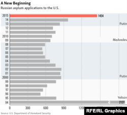 Кількість нових клопотань про надання притулку в США росіянами досягла свого найвищого рівня за більш ніж два десятиліття. Російські громадяни подали 1 454 нових клопотань про надання притулку в 2015 фінансовому році, що закінчився 30 вересня. Це означає 50-відсотковий приріст у порівнянні з попереднім роком і зростання більш ніж у два рази в порівнянні з 2012 роком, коли президент Росії Володимир Путін повернувся в Кремль після чотирирічного перебування на посту прем’єр-міністра. Такі дані Радіо Свобода отримало від Міністерства внутрішньої безпеки США на основі закону США про свободу інформації.